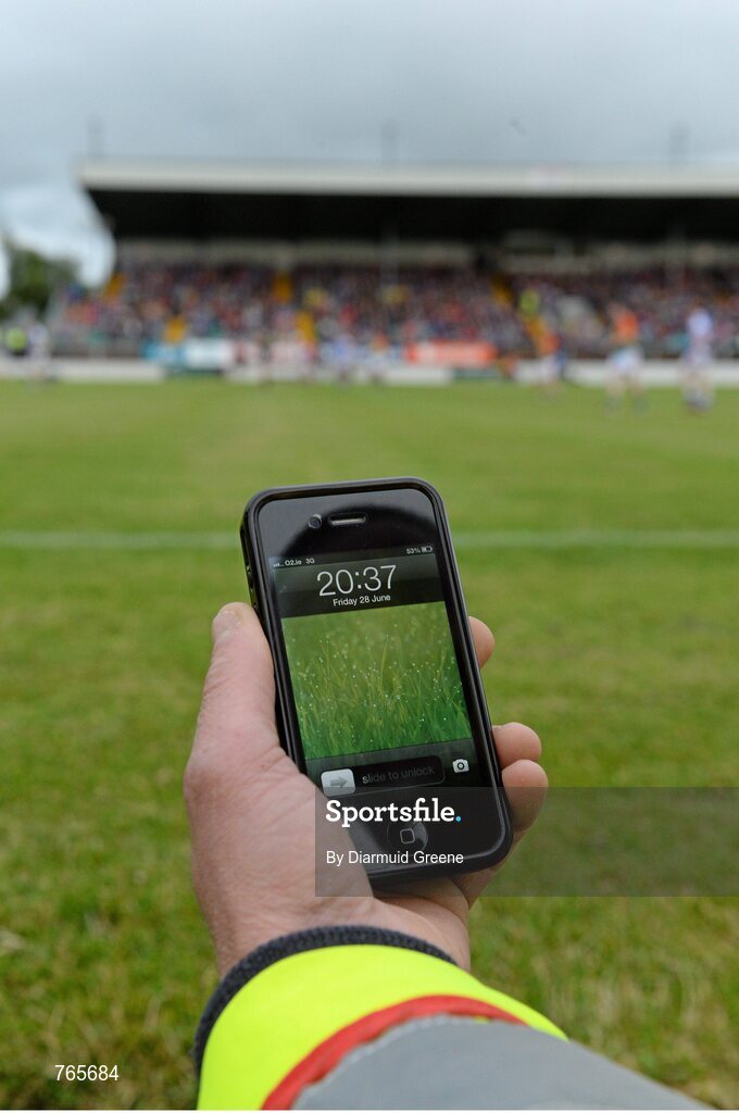 28 June 2013; Mick Curran, on duty with Order of Malta Carlow, looks at the time and date on his phone at the start of the second half. GAA Football All-Ireland Senior Championship, Round 1, Carlow v Laois, Dr. Cullen Park, Carlow. Picture credit: Diarmuid Greene / SPORTSFILE