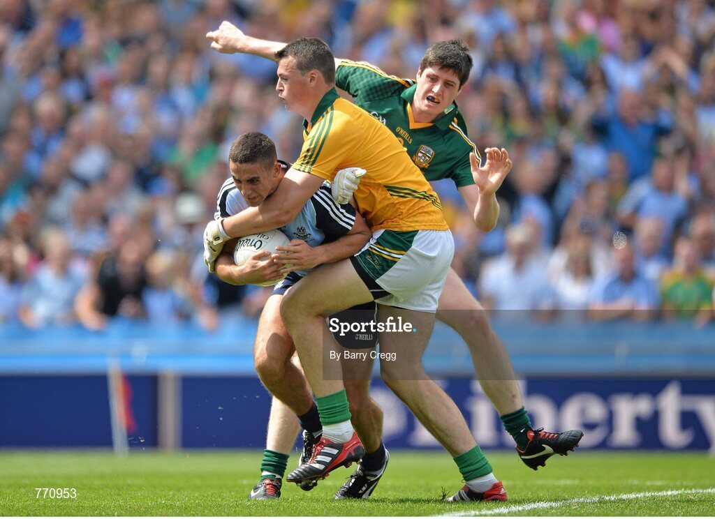14 July 2013; James McCarthy, Dublin, in action against Paddy O'Rourke, centre, and Conor Gillespie, Meath. Leinster GAA Football Senior Championship Final, Meath v Dublin, Croke Park, Dublin. Picture credit: Barry Cregg / SPORTSFILE