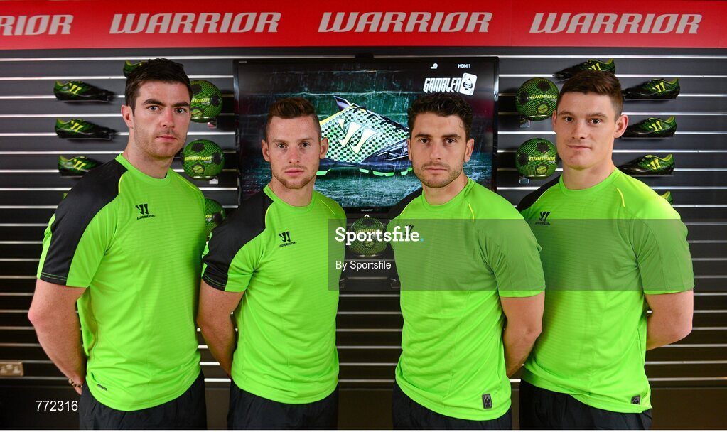 17 July 2013; Dublin footballers, from left, Michael Darragh Macauley, Philly McMahon, Bernard Flynn, and Diarmuid Connolly, in attendance at the announcement of the official ambassadors for Warrior Sports. JACC Sports Distributors Limited, Ballymount Cross, Dublin. Photo by Sportsfile