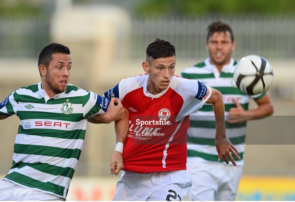 23 July 2013; Peter Durrad, St. Patrick's Athletic, in action against Billy Dennehy, Shamrock Rovers. EA Sports Quarter-Final, Shamrock Rovers v St. Patrick's Athletic, Tallaght Stadium, Tallaght, Dublin. Picture credit: David Maher / SPORTSFILE