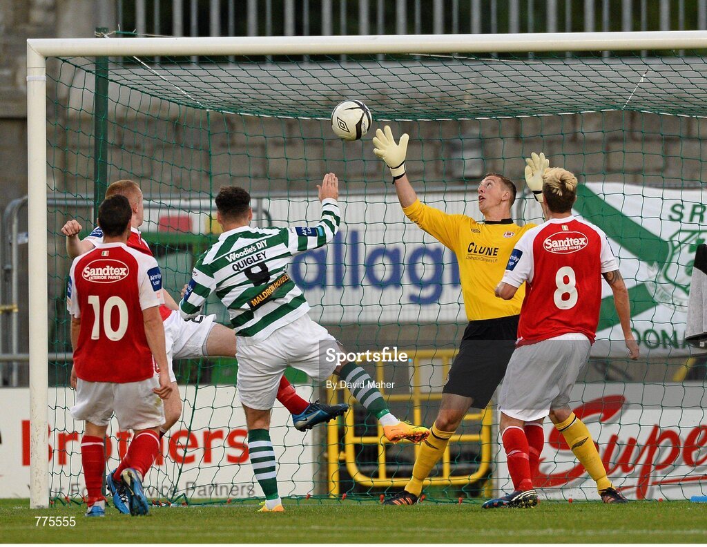 23 July 2013; Mark Quigley, Shamrock Rovers, beats St. Patrick's Athletic goalkeeper Rene Gilmartin to score his side's first goal. EA Sports Quarter-Final, Shamrock Rovers v St. Patrick's Athletic, Tallaght Stadium, Tallaght, Dublin. Picture credit: David Maher / SPORTSFILE