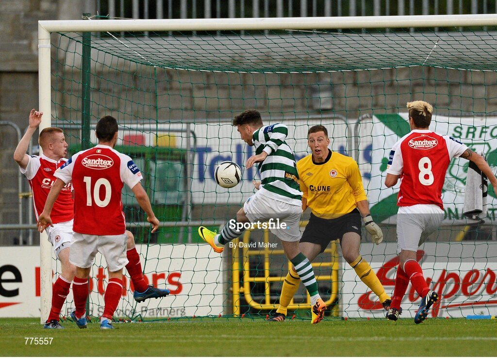 23 July 2013; Mark Quigley, Shamrock Rovers, beats St. Patrick's Athletic goalkeeper Rene Gilmartin to score his side's first goal. EA Sports Quarter-Final, Shamrock Rovers v St. Patrick's Athletic, Tallaght Stadium, Tallaght, Dublin. Picture credit: David Maher / SPORTSFILE
