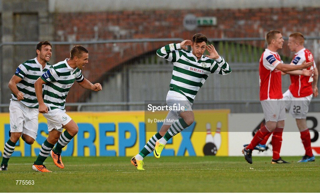 23 July 2013; Mark Quigley, Shamrock Rovers, celebrates after scoring his side's first goal. EA Sports Quarter-Final, Shamrock Rovers v St. Patrick's Athletic, Tallaght Stadium, Tallaght, Dublin. Picture credit: David Maher / SPORTSFILE