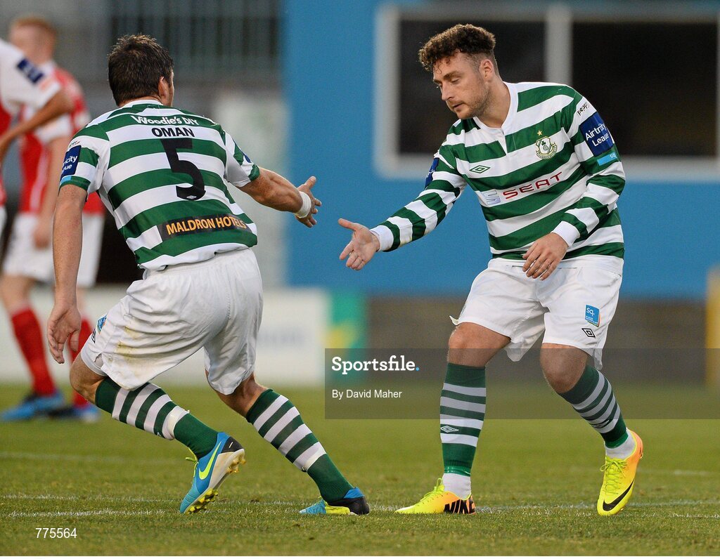23 July 2013; Mark Quigley, right, Shamrock Rovers, celebrates after scoring his side's first goal with team-mate Ken Oman. EA Sports Quarter-Final, Shamrock Rovers v St. Patrick's Athletic, Tallaght Stadium, Tallaght, Dublin. Picture credit: David Maher / SPORTSFILE