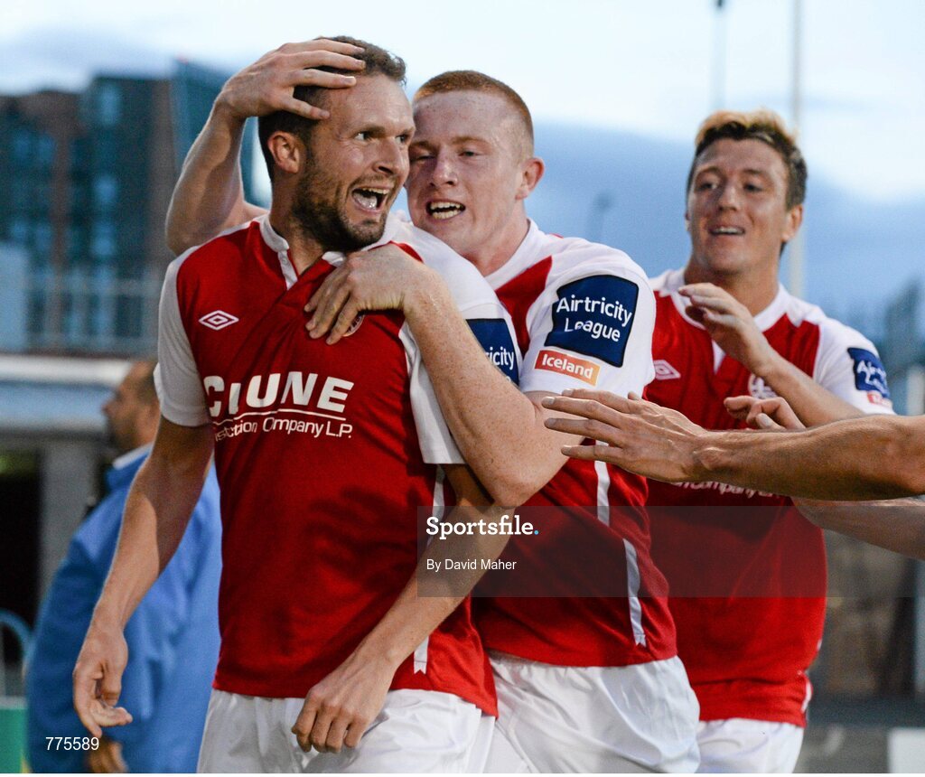 23 July 2013; Conan Byrne, left, St. Patrick's Athletic, celebrates after scoring his side's first goal with team-mates Lorcan Fitzgerald and Shane McFaul. EA Sports Quarter-Final, Shamrock Rovers v St. Patrick's Athletic, Tallaght Stadium, Tallaght, Dublin. Picture credit: David Maher / SPORTSFILE