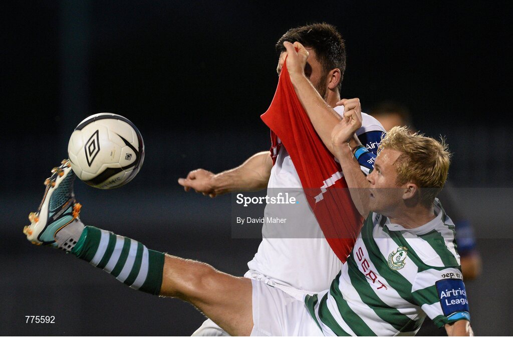 23 July 2013; Conor McCormack, Shamrock Rovers, in action against Killian Brennan, St. Patrick's Athletic. EA Sports Quarter-Final, Shamrock Rovers v St. Patrick's Athletic, Tallaght Stadium, Tallaght, Dublin. Picture credit: David Maher / SPORTSFILE