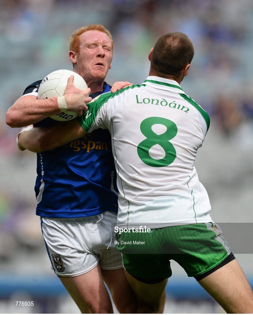 27 July 2013; Cian Mackey, Cavan, in action against Caolan Doyle, London. GAA Football All-Ireland Senior Championship, Round 4, London v Cavan, Croke Park, Dublin. Picture credit: David Maher / SPORTSFILE