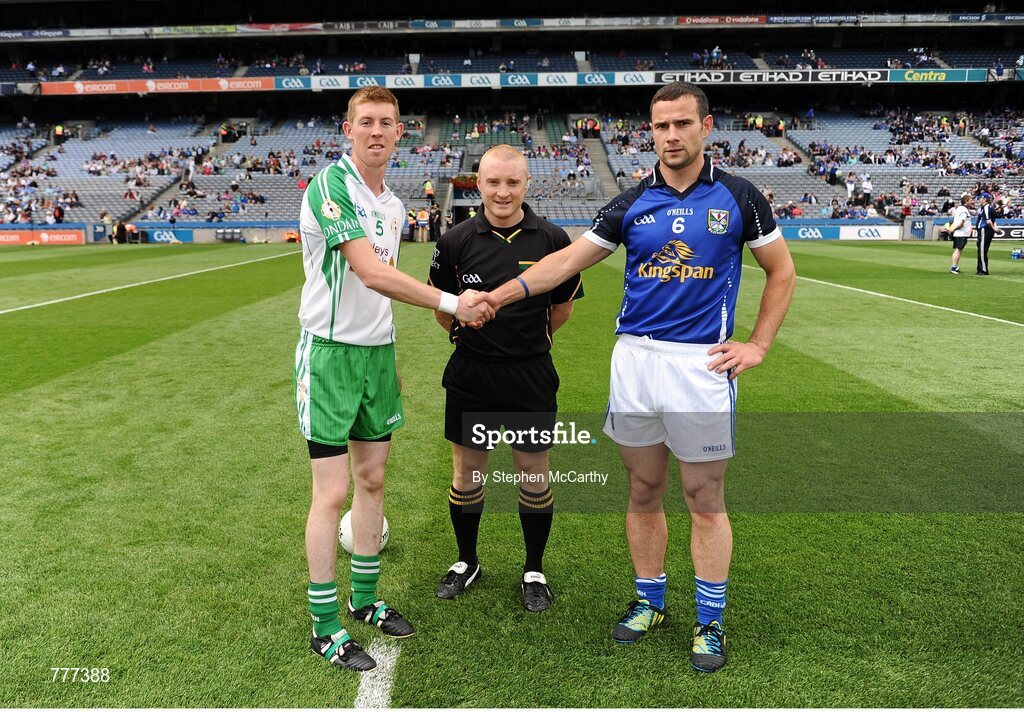 27 July 2013; Referee Barry Cassidy with London captain Séamus Hannon and Cavan captain Alan Clarek. GAA Football All-Ireland Senior Championship, Round 4, London v Cavan, Croke Park, Dublin. Picture credit: Stephen McCarthy / SPORTSFILE