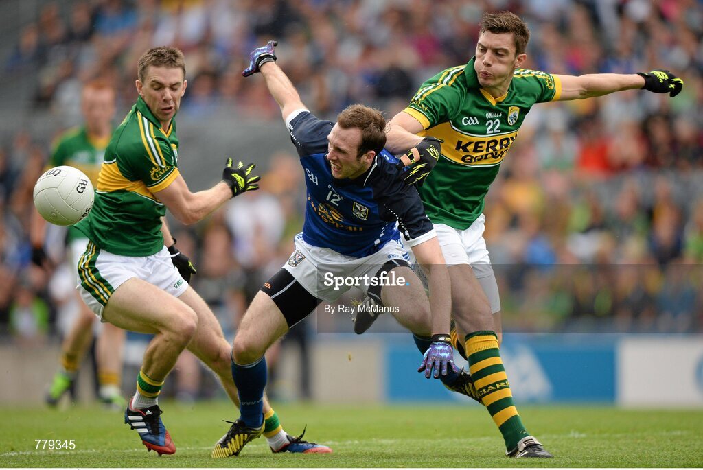 4 August 2013; Marc Ó Sé, left, and David Moran, Kerry, in action against Fergal Flanagan, Cavan. GAA Football All-Ireland Senior Championship, Quarter-Final, Kerry v Cavan, Croke Park, Dublin. Picture credit: Ray McManus / SPORTSFILE