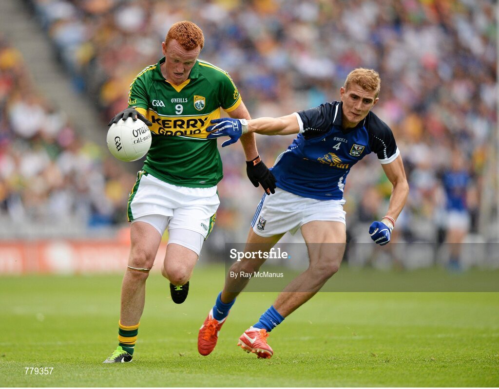 4 August 2013; Johnny Buckley, Kerry, is tackled by Killian Clarke, Cavan. GAA Football All-Ireland Senior Championship, Quarter-Final, Kerry v Cavan, Croke Park, Dublin. Picture credit: Ray McManus / SPORTSFILE