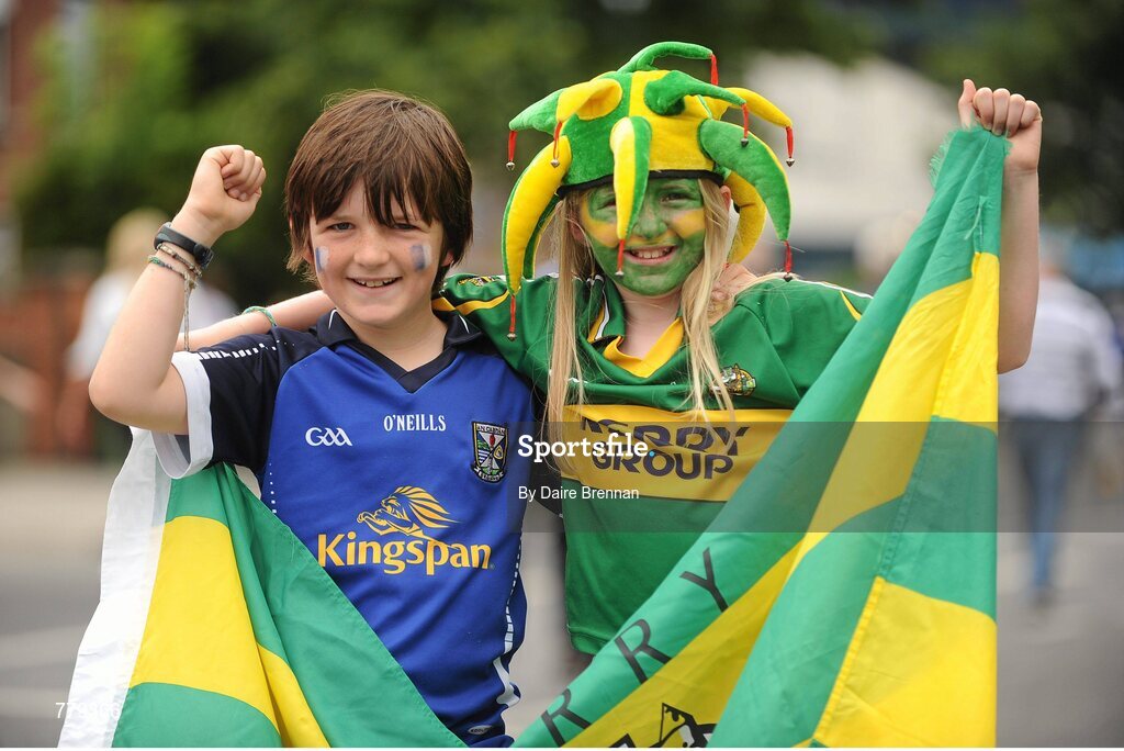 4 August 2013; Brother and sister Donal O'Sullivan, aged 8, and Emer O'Sullivan, aged 10, from Ardfert, Co. Kerry, but with a Cavan mother, on their way to the game. GAA Football All-Ireland Senior Championship, Quarter-Final, Kerry v Cavan, Croke Park, Dublin. Picture credit: Dáire Brennan / SPORTSFILE
