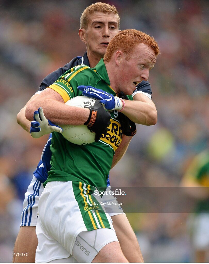 4 August 2013; Johnny Buckley, Kerry, is tackled by Killian Clarke, Cavan. GAA Football All-Ireland Senior Championship, Quarter-Final, Kerry v Cavan, Croke Park, Dublin. Picture credit: Ray McManus / SPORTSFILE