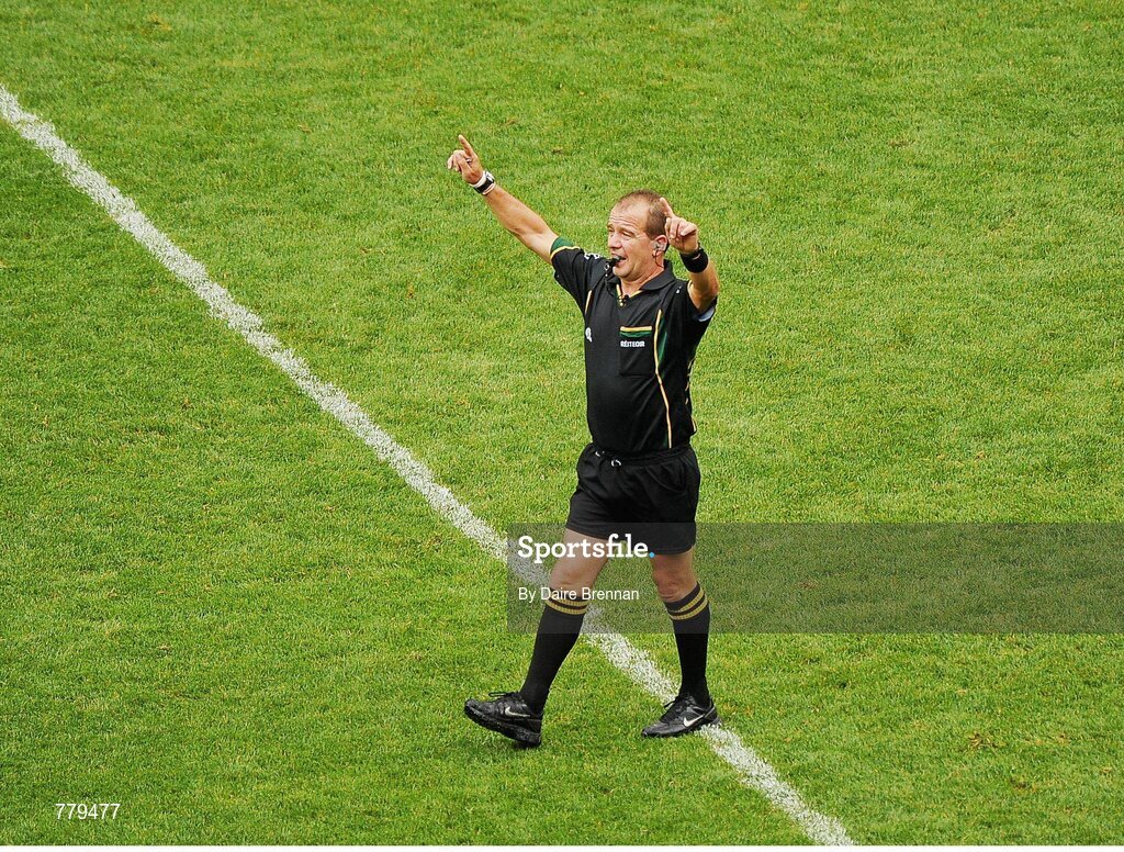4 August 2013; Referee Eddie Kinsella signals for 'hawkeye'. GAA Football All-Ireland Senior Championship, Quarter-Final, Kerry v Cavan, Croke Park, Dublin. Picture credit: Dáire Brennan / SPORTSFILE