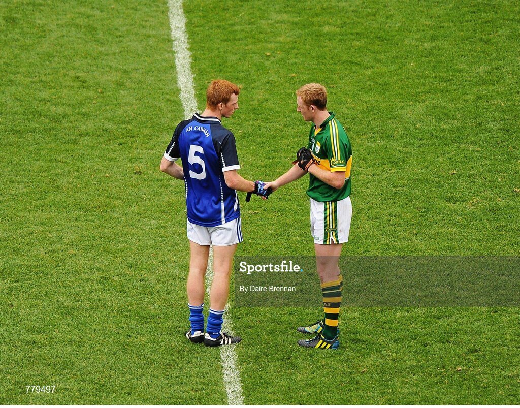 4 August 2013; Kerry captain Colm Cooper shakes hands with James McLoughlin, Cavan. GAA Football All-Ireland Senior Championship, Quarter-Final, Kerry v Cavan, Croke Park, Dublin. Picture credit: Dáire Brennan / SPORTSFILE