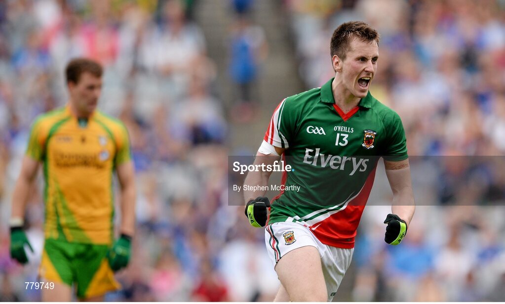 4 August 2013; Cillian O'Connor, Mayo, celebrates after scoring his side's third goal. GAA Football All-Ireland Senior Championship, Quarter-Final, Mayo v Donegal, Croke Park, Dublin. Picture credit: Stephen McCarthy / SPORTSFILE