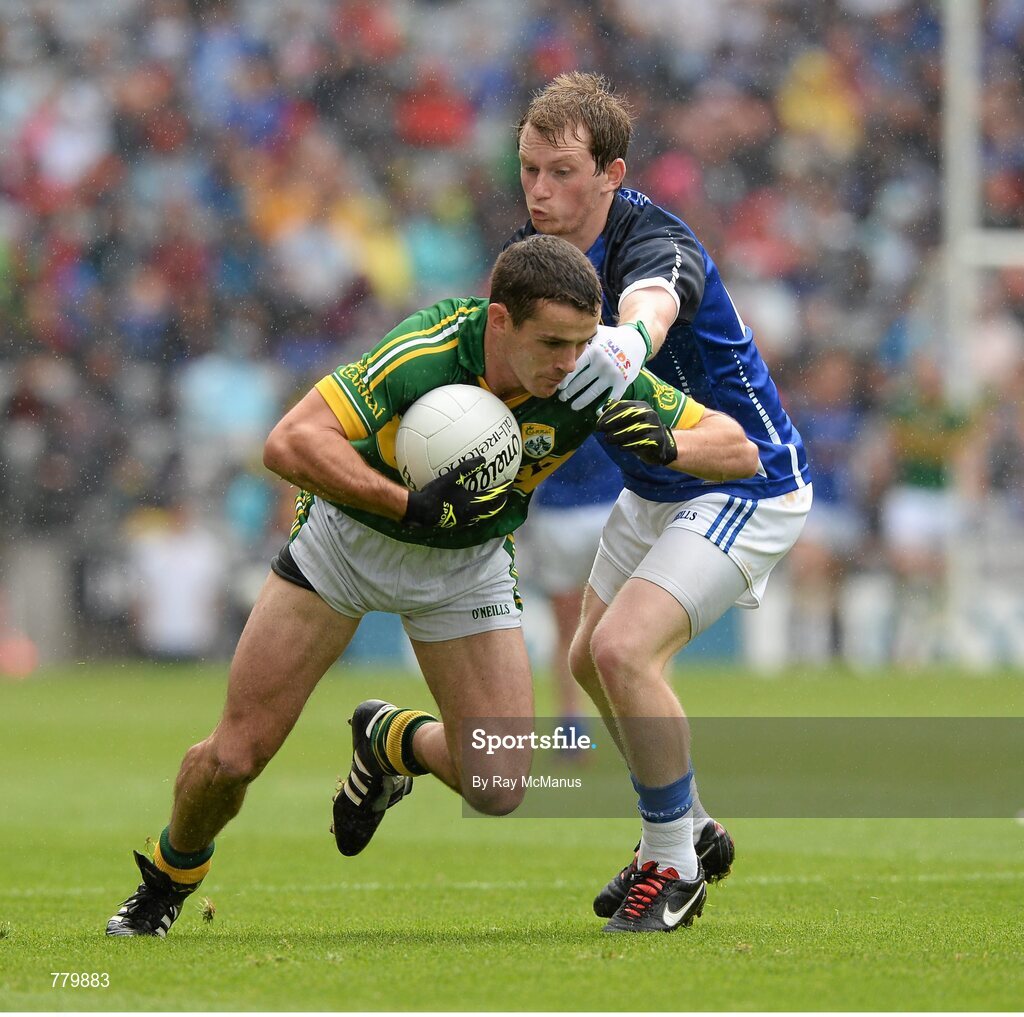4 August 2013; Shane Enright, Kerry, is tackled by Martin Dunne, Cavan. GAA Football All-Ireland Senior Championship, Quarter-Final, Kerry v Cavan, Croke Park, Dublin. Picture credit: Ray McManus / SPORTSFILE