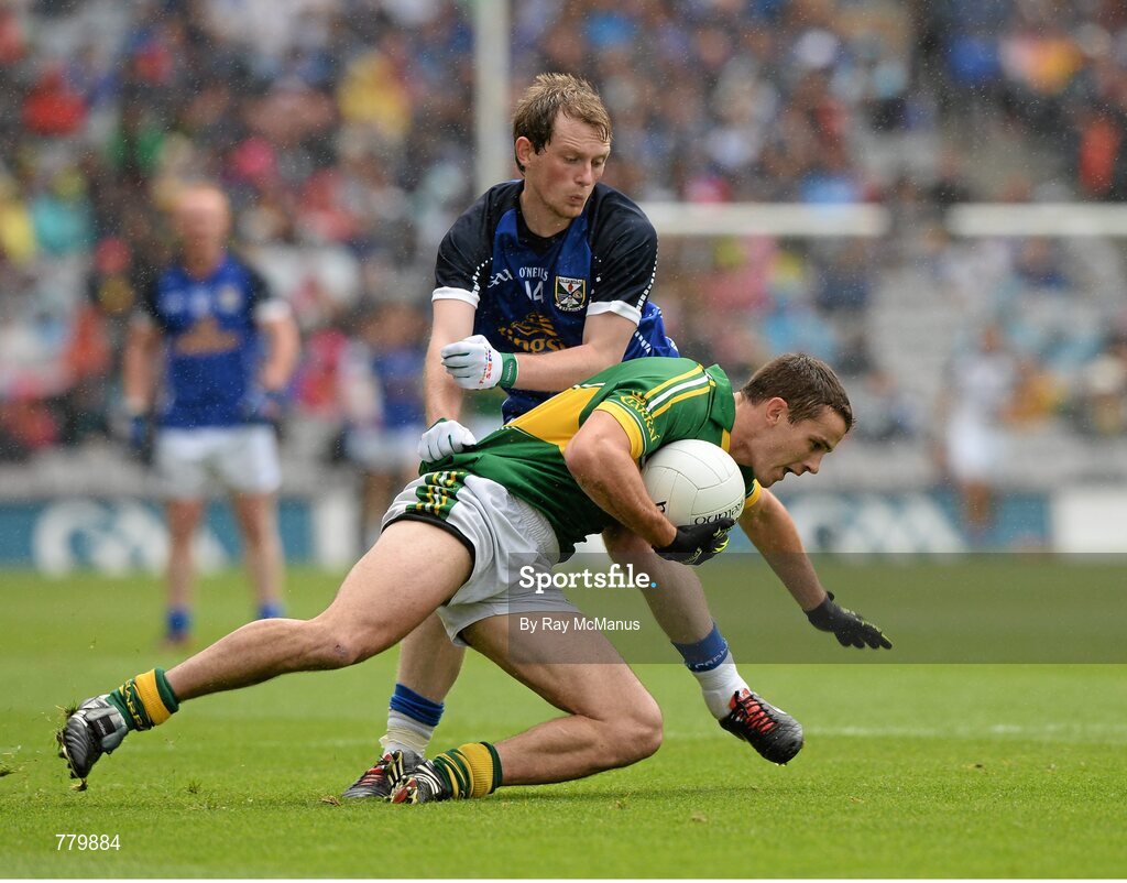 4 August 2013; Shane Enright, Kerry, is tackled by Martin Dunne, Cavan. GAA Football All-Ireland Senior Championship, Quarter-Final, Kerry v Cavan, Croke Park, Dublin. Picture credit: Ray McManus / SPORTSFILE