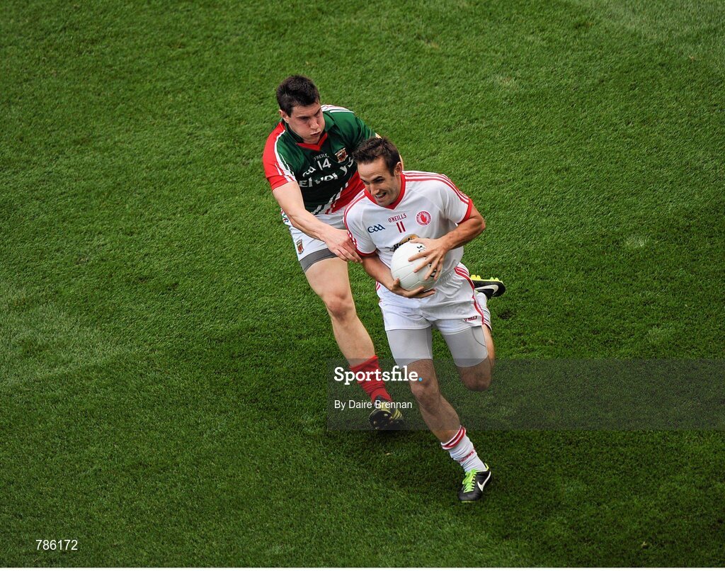 25 August 2013; Mark Donnelly, Tyrone, in action against Alan Freeman, Mayo. GAA Football All-Ireland Senior Championship Semi-Final, Mayo v Tyrone, Croke Park, Dublin. Picture credit: Dáire Brennan / SPORTSFILE