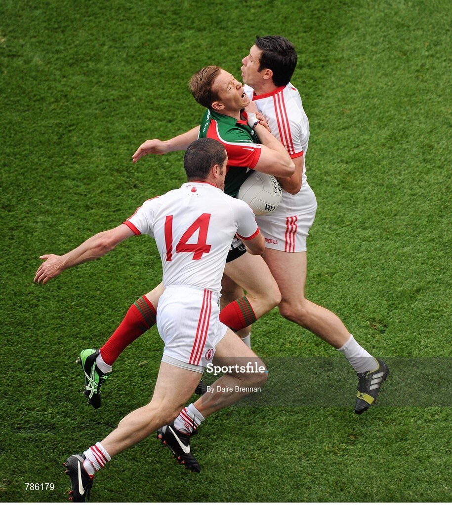 25 August 2013; Donal Vaughan, Mayo, in action against Stephen O'Neill, left, and Seán Cavanagh, Tyrone. GAA Football All-Ireland Senior Championship Semi-Final, Mayo v Tyrone, Croke Park, Dublin. Picture credit: Dáire Brennan / SPORTSFILE