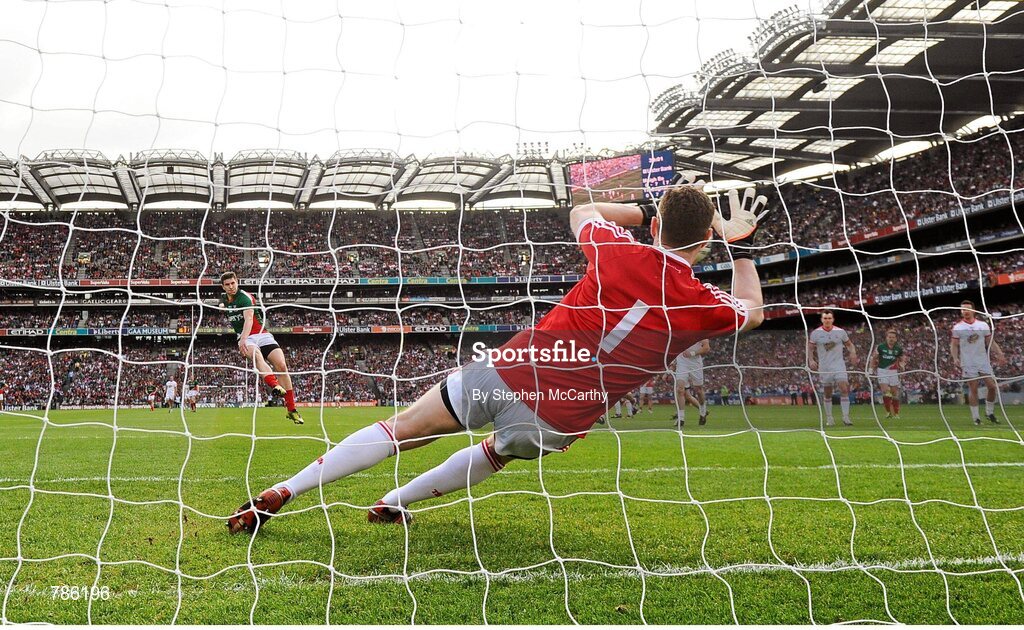 25 August 2013; Alan Freeman, Mayo, scores his side's first goal from a penalty past Tyrone goalkeeper Pascal McConnell. GAA Football All-Ireland Senior Championship Semi-Final, Mayo v Tyrone, Croke Park, Dublin. Picture credit: Stephen McCarthy / SPORTSFILE