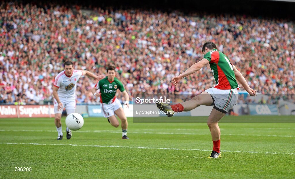 25 August 2013; Alan Freeman, Mayo, scores his side's first goal from a penalty. GAA Football All-Ireland Senior Championship Semi-Final, Mayo v Tyrone, Croke Park, Dublin. Picture credit: Stephen McCarthy / SPORTSFILE