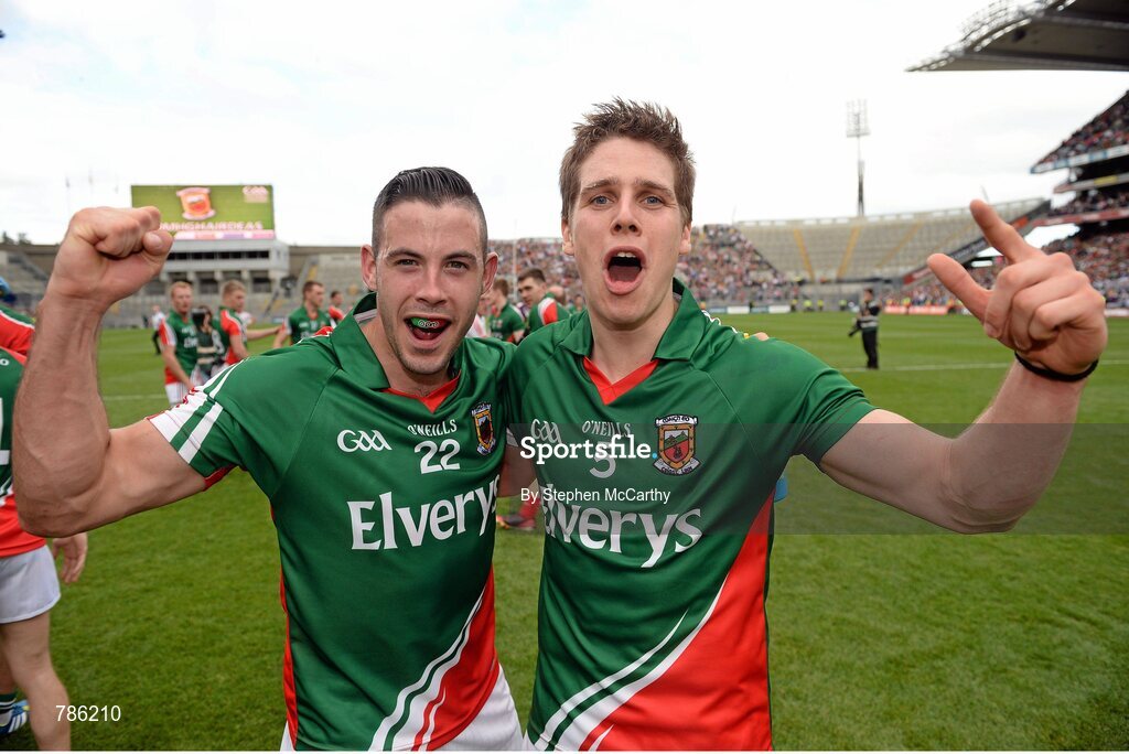 25 August 2013; Cathal Carolan, left, and Lee Keegan, Mayo, celebrate their side's victory. GAA Football All-Ireland Senior Championship Semi-Final, Mayo v Tyrone, Croke Park, Dublin. Picture credit: Stephen McCarthy / SPORTSFILE