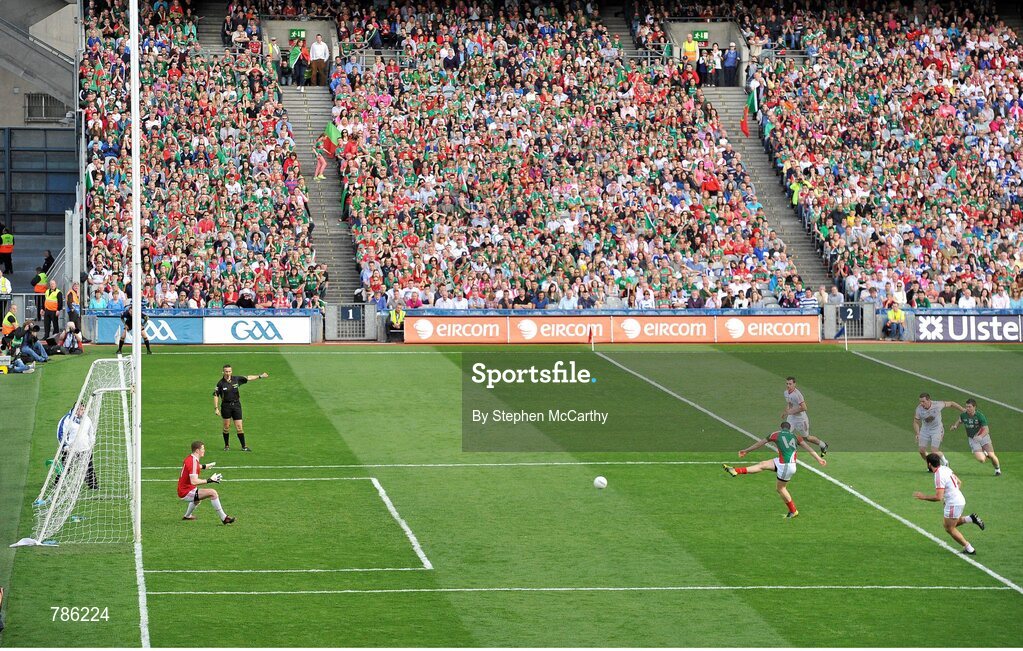 25 August 2013; Alan Freeman, Mayo, shoots to score his side's goal, from a penalty, past Tyrone goalkeeper Pascal McConnell. GAA Football All-Ireland Senior Championship Semi-Final, Mayo v Tyrone, Croke Park, Dublin. Picture credit: Stephen McCarthy / SPORTSFILE