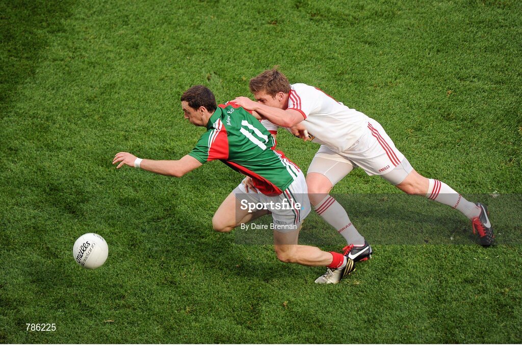 25 August 2013; Keith Higgins, Mayo, in action against Dermot Carlin, Tyrone. GAA Football All-Ireland Senior Championship Semi-Final, Mayo v Tyrone, Croke Park, Dublin. Picture credit: Dáire Brennan / SPORTSFILE