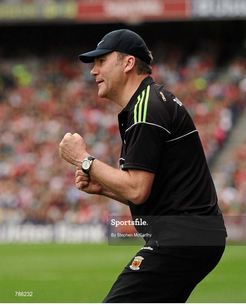 25 August 2013; Mayo manager James Horan celebrates a late score. GAA Football All-Ireland Senior Championship Semi-Final, Mayo v Tyrone, Croke Park, Dublin. Picture credit: Stephen McCarthy / SPORTSFILE