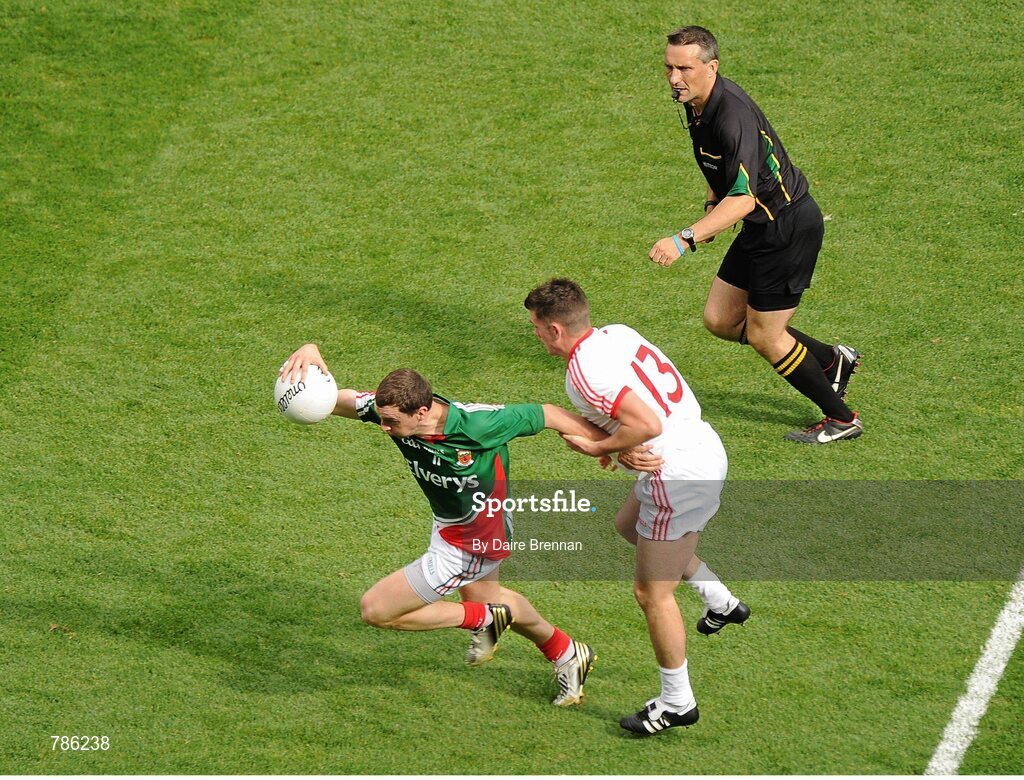 25 August 2013; Keith Higgins, Mayo, in action against Darren McCurry, Tyrone. GAA Football All-Ireland Senior Championship Semi-Final, Mayo v Tyrone, Croke Park, Dublin. Picture credit: Dáire Brennan / SPORTSFILE