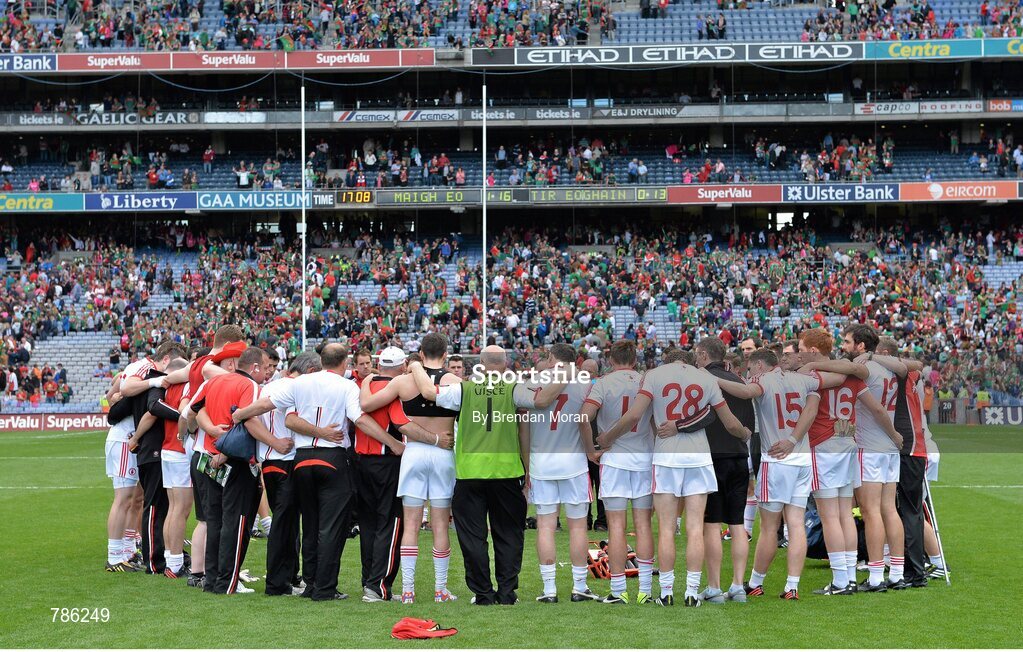 25 August 2013; The Tyrone squad listen to manager Mickey Harte after the game. GAA Football All-Ireland Senior Championship Semi-Final, Mayo v Tyrone, Croke Park, Dublin. Picture credit: Brendan Moran / SPORTSFILE