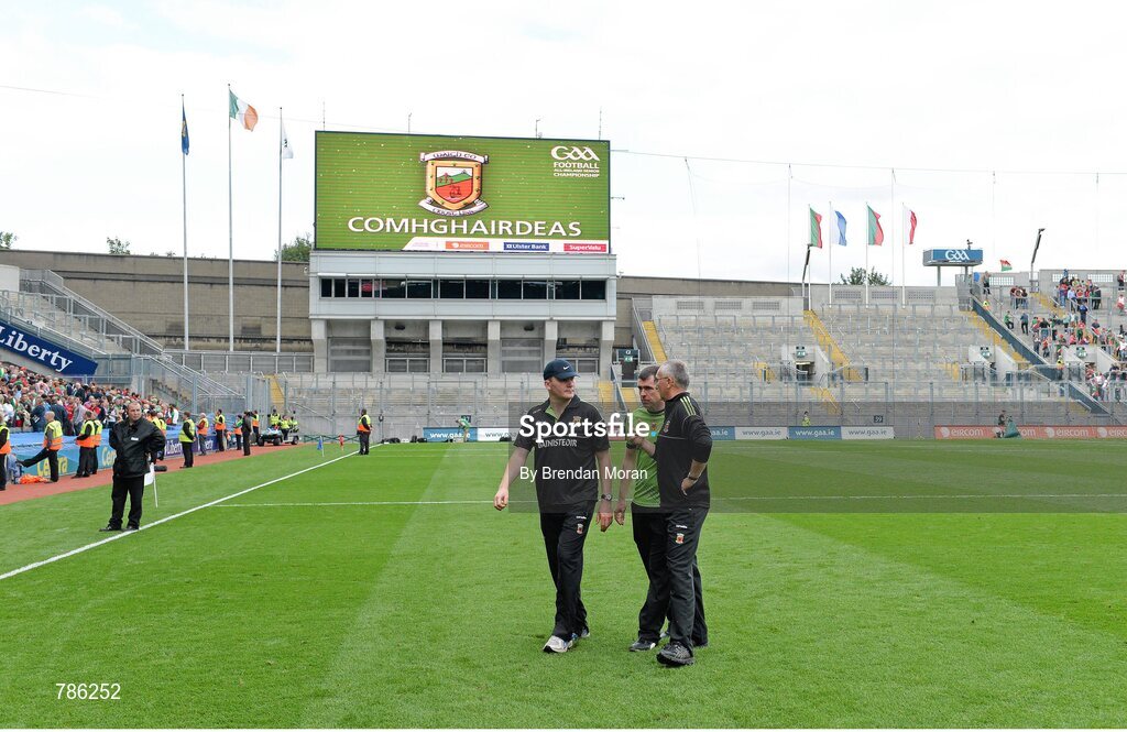 25 August 2013; Mayo manager James Horan and selectors Tom Prendergast, centre, and Donie Buckley, right, leave the pitch after the game. GAA Football All-Ireland Senior Championship Semi-Final, Mayo v Tyrone, Croke Park, Dublin. Picture credit: Brendan Moran / SPORTSFILE