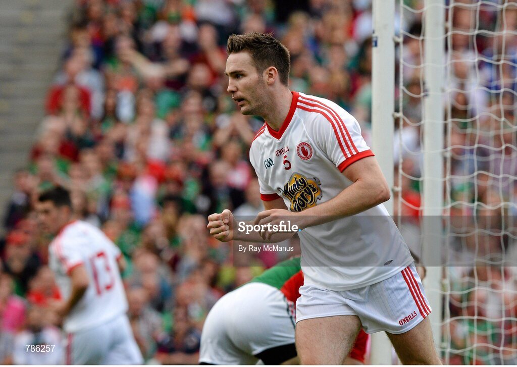 25 August 2013; Ciarán McGinley, Tyrone, celebrates after scoring the first point of the game. GAA Football All-Ireland Senior Championship Semi-Final, Mayo v Tyrone, Croke Park, Dublin. Picture credit: Ray McManus / SPORTSFILE
