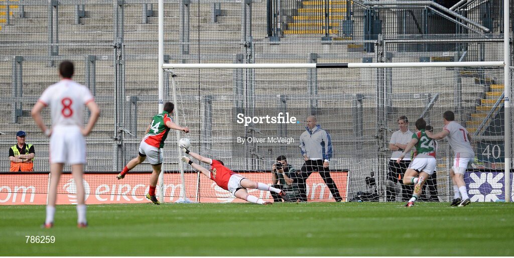 25 August 2013; Alan Freeman, Mayo, scores a second half penalty past Pascal McConnell, Tyrone. GAA Football All-Ireland Senior Championship Semi-Final, Mayo v Tyrone, Croke Park, Dublin. Picture credit: Oliver McVeigh / SPORTSFILE