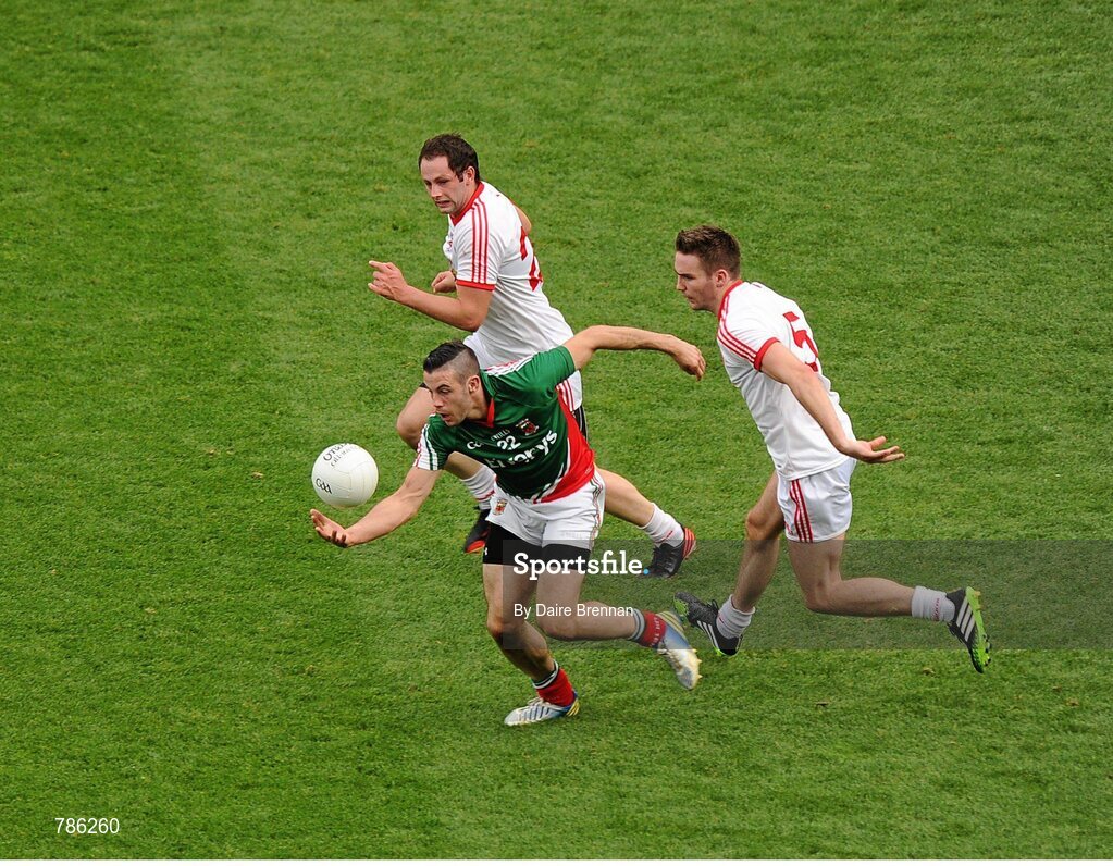 25 August 2013; Cathal Carolan, Mayo, in action against Ronan McNabb, left, and Ciarán McGinley, Tyrone. GAA Football All-Ireland Senior Championship Semi-Final, Mayo v Tyrone, Croke Park, Dublin. Picture credit: Dáire Brennan / SPORTSFILE