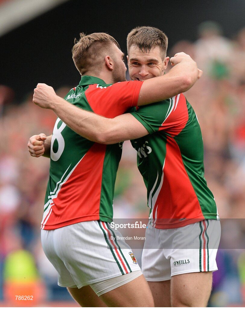 25 August 2013; Brothers Aidan, left, and Seamus O'Shea, Mayo, celebrate after the game. GAA Football All-Ireland Senior Championship Semi-Final, Mayo v Tyrone, Croke Park, Dublin. Picture credit: Brendan Moran / SPORTSFILE