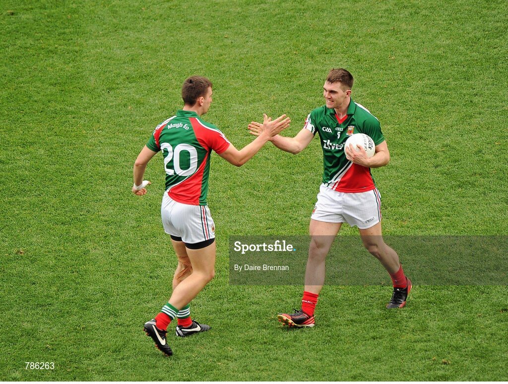 25 August 2013; Mayo players, Barry Moran, left, and Séamus O'Shea, celebrate at the end of the game. GAA Football All-Ireland Senior Championship Semi-Final, Mayo v Tyrone, Croke Park, Dublin. Picture credit: Dáire Brennan / SPORTSFILE