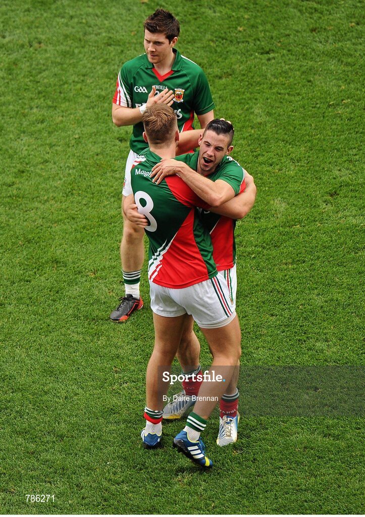 25 August 2013; Aidan O'Shea, left, and Cathal Carolan celebrate after the game. GAA Football All-Ireland Senior Championship Semi-Final, Mayo v Tyrone, Croke Park, Dublin. Picture credit: Dáire Brennan / SPORTSFILE