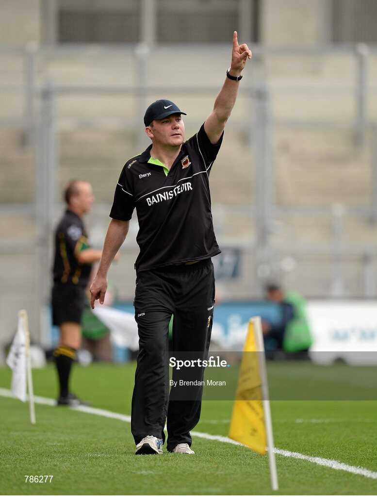 25 August 2013; Mayo manager James Horan signls during the finnal moments of the game. GAA Football All-Ireland Senior Championship Semi-Final, Mayo v Tyrone, Croke Park, Dublin. Picture credit: Brendan Moran / SPORTSFILE