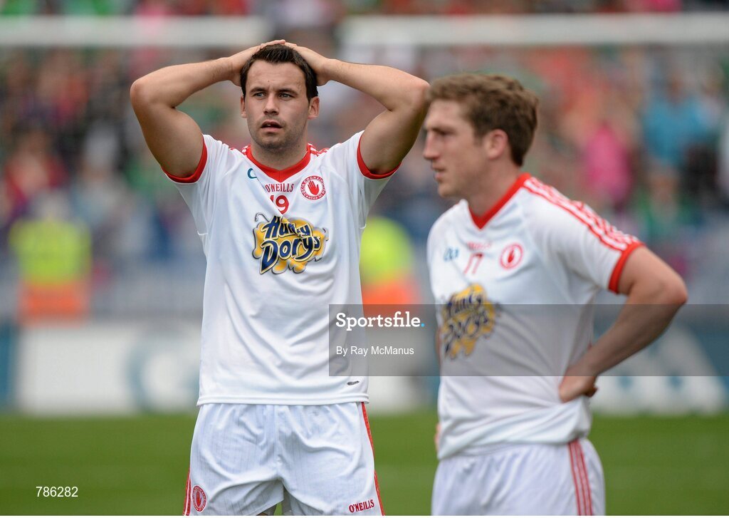 25 August 2013; Tyrone players Kyle Coney, left, and Dermot Carlin after the game. GAA Football All-Ireland Senior Championship Semi-Final, Mayo v Tyrone, Croke Park, Dublin. Picture credit: Ray McManus / SPORTSFILE