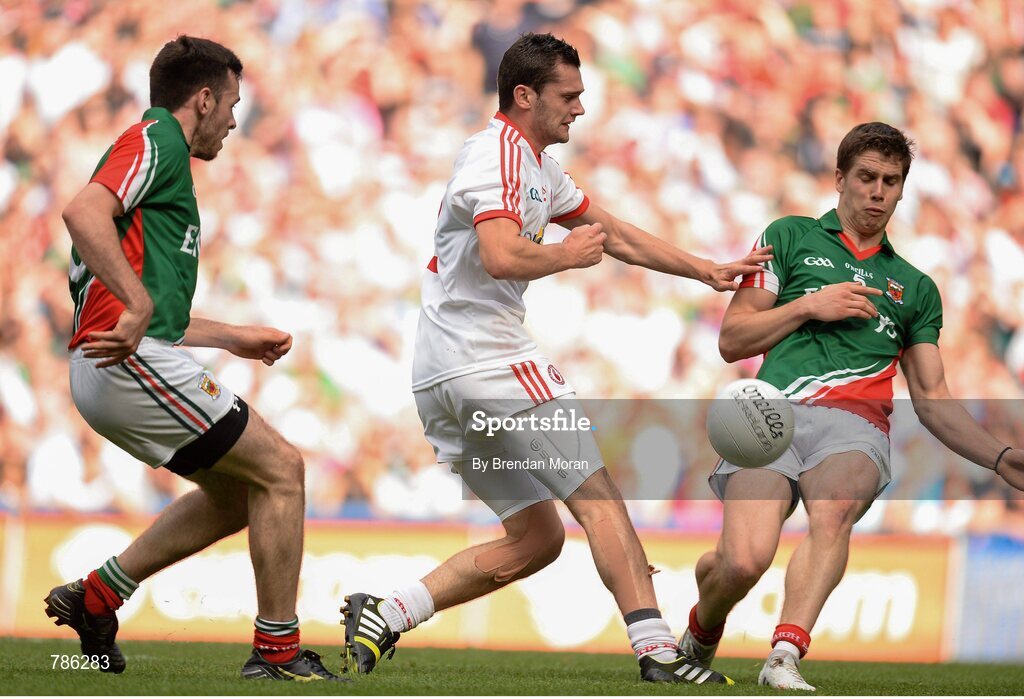 25 August 2013; Ryan McKenna, Tyrone, has his shot on goal blocked by Lee Keegan, right, Mayo. GAA Football All-Ireland Senior Championship Semi-Final, Mayo v Tyrone, Croke Park, Dublin. Picture credit: Brendan Moran / SPORTSFILE