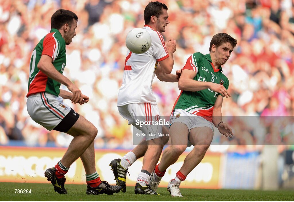 25 August 2013; Ryan McKenna, Tyrone, has his shot on goal blocked by Lee Keegan, right, Mayo. GAA Football All-Ireland Senior Championship Semi-Final, Mayo v Tyrone, Croke Park, Dublin. Picture credit: Brendan Moran / SPORTSFILE