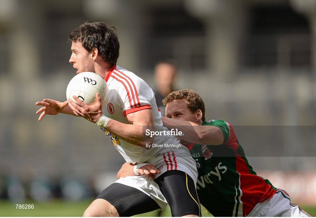 25 August 2013; Matthew Donnelly, Tyrone, in action against Andy Moran, Mayo. GAA Football All-Ireland Senior Championship Semi-Final, Mayo v Tyrone, Croke Park, Dublin. Picture credit: Oliver McVeigh / SPORTSFILE
