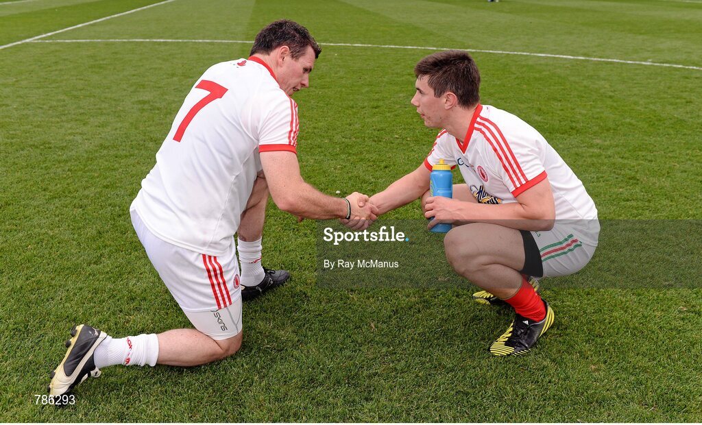 25 August 2013; Conor Gormley, left, Tyrone, is comforted by Mayo's Alan Freeman, wearing a Tyrone jersey, after the game. GAA Football All-Ireland Senior Championship Semi-Final, Mayo v Tyrone, Croke Park, Dublin. Picture credit: Ray McManus / SPORTSFILE