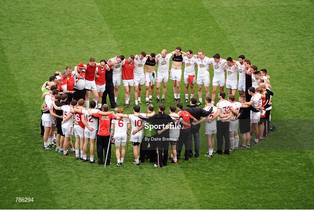 25 August 2013; The Tyrone team huddle after the game. GAA Football All-Ireland Senior Championship Semi-Final, Mayo v Tyrone, Croke Park, Dublin. Picture credit: Dáire Brennan / SPORTSFILE