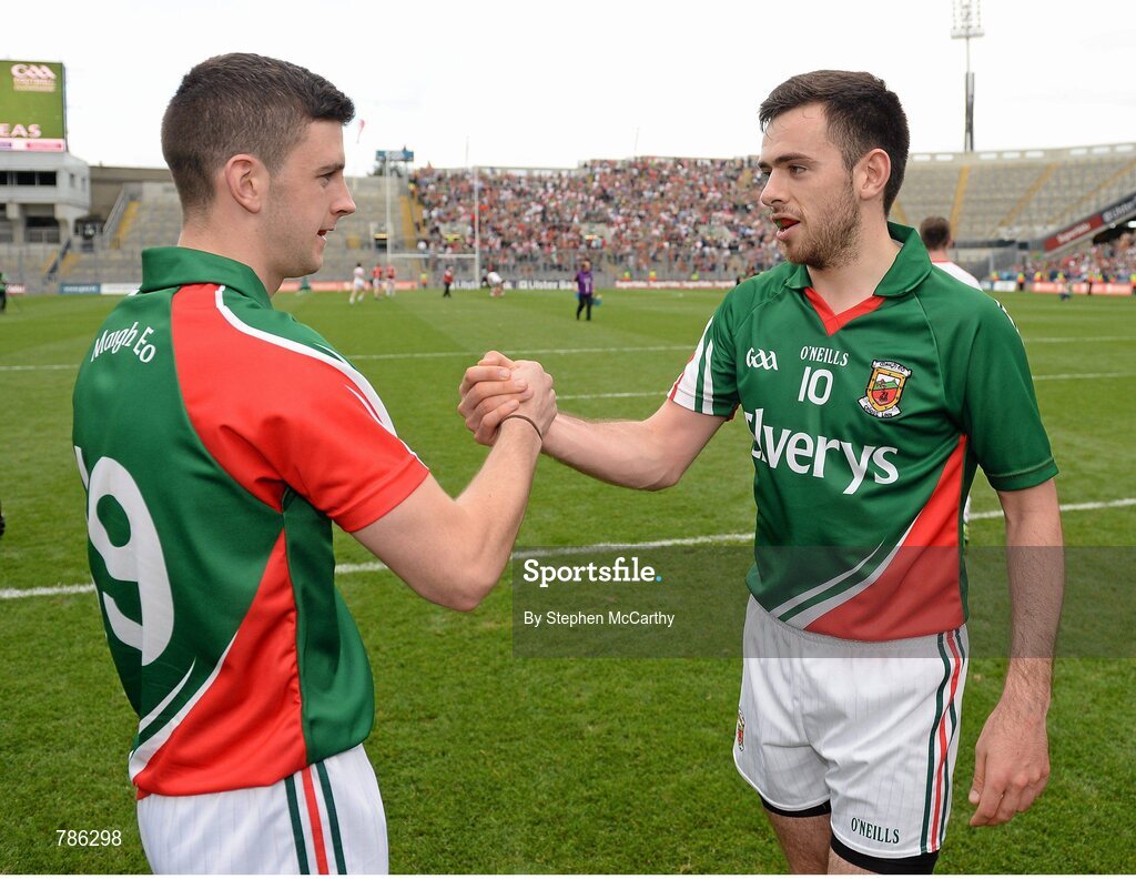 25 August 2013; Kevin McLoughlin, right, and Brendan Harrison, Mayo, following their victory. GAA Football All-Ireland Senior Championship Semi-Final, Mayo v Tyrone, Croke Park, Dublin. Picture credit: Stephen McCarthy / SPORTSFILE