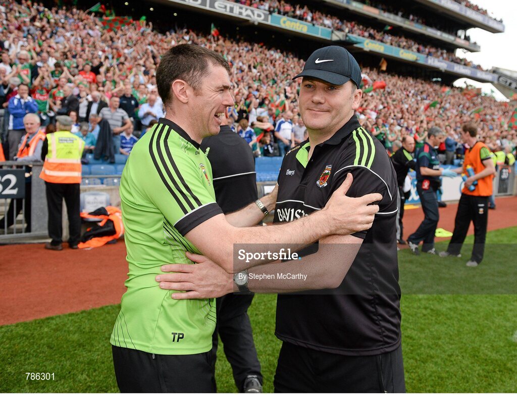 25 August 2013; Mayo manager James Horan and selector Tom Prendergast following their side's victory. GAA Football All-Ireland Senior Championship Semi-Final, Mayo v Tyrone, Croke Park, Dublin. Picture credit: Stephen McCarthy / SPORTSFILE