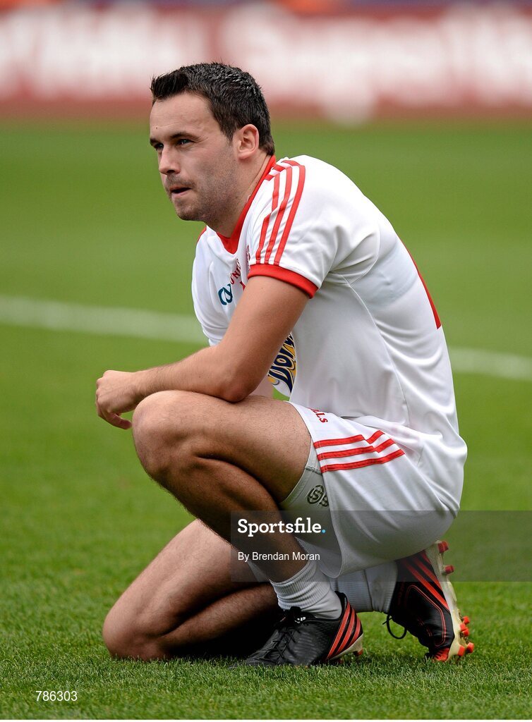 25 August 2013; A dejected Kyle Coney, Tyrone, after the final whistle. GAA Football All-Ireland Senior Championship Semi-Final, Mayo v Tyrone, Croke Park, Dublin. Picture credit: Brendan Moran / SPORTSFILE
