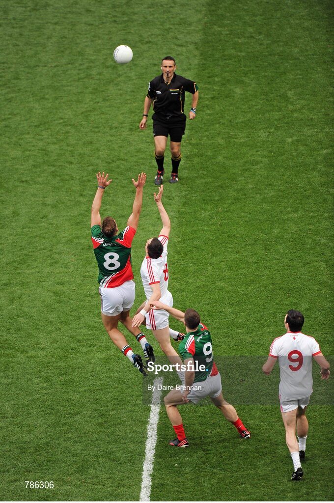 25 August 2013; Mayo midfielders and brothers Aidan, left, and Séamus O'Shea, contest the throw-in against Tyrone midfielders and brothers, Seán, left, and Colm Cavanagh. GAA Football All-Ireland Senior Championship Semi-Final, Mayo v Tyrone, Croke Park, Dublin. Picture credit: Dáire Brennan / SPORTSFILE