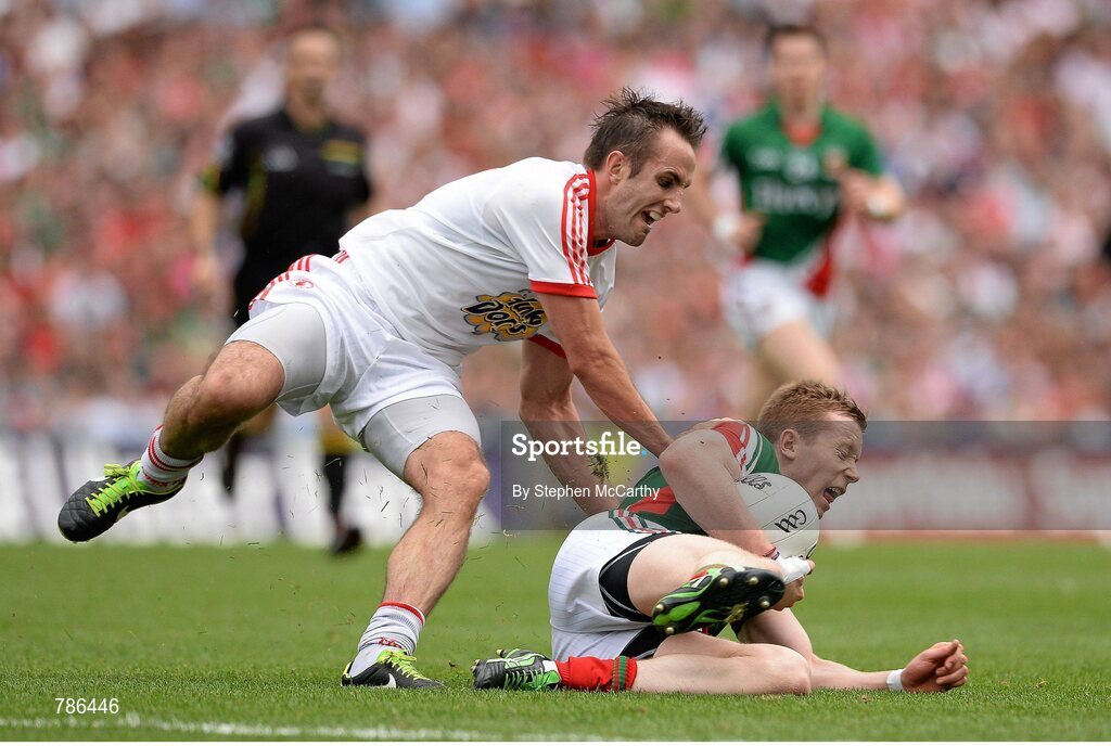 25 August 2013; Donal Vaughan, Mayo, in action against Mark Donnelly, Tyrone. GAA Football All-Ireland Senior Championship Semi-Final, Mayo v Tyrone, Croke Park, Dublin. Picture credit: Stephen McCarthy / SPORTSFILE